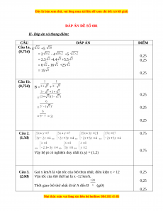 II- Đáp án và thang điểm: CÂU ĐÁP ÁN ĐIỂM Câu 1a. - 4 +5 (0,75đ) = 2 - 4 +5 0,25 = 2.3 -4.4 +5.5 0,25 = 6 - 16 +25 = 15 0,25 Câu 1b. (0,75đ) B = + 0,25 = = 0,25 = = 3 0,25 Câu 2. 0,75 (1,5đ)