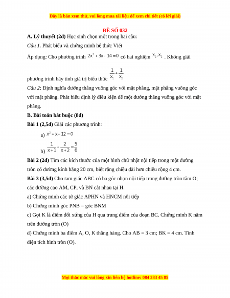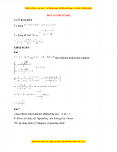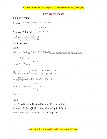 ĐÁP ÁN ĐỀ SỐ 032 A.LÝ THUYẾT Áp dụng Áp dụng hệ thức Vi et B.BÀI TOÁN Bài 1 có