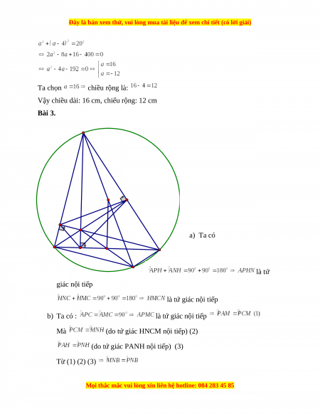 Vậy chiều dài: 16 cm, chiểu rộng: 12 cm Bài 3. a) Ta có là tứ giác nội tiếp là tứ giác nội tiếp b) Ta có : là tứ giác nội tiếp Mà