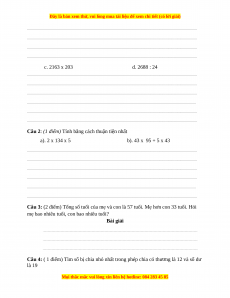 Bài 2: (1đ) Tính bằng cách thuận tiện nhất : Làm đúng mỗi phần cho 0,5đ a. 2 x 134 x 5 = (2 x 5) x 134 b. 43 x 95 + 5 x 43 = 10 x 134 = 43 x (95 + 5) = 1340 = 43 x 100 = 4300 Bài 3: (2 điểm) Bài giải Tuổi của mẹ là: (57 + 33) : 2 = 45 (tuổi) Tuổi của con là: (57 - 33) : 2 = 12(tuổi)