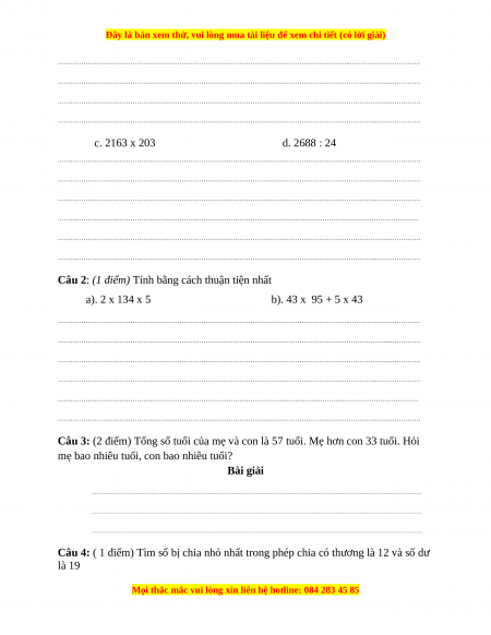 Câu 3: (2 điểm) Tổng số tuổi của mẹ và con là 57 tuổi. Mẹ hơn con 33 tuổi. Hỏi
