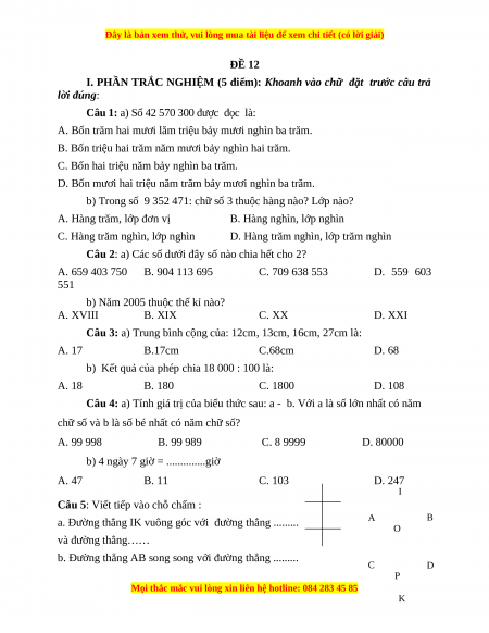 Đề thi Toán lớp 4 cuối kì 1 năm 2022 - 2023 (Đề 12)
