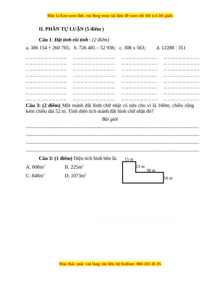 Câu 3: (1 điểm) Diện tích hình bên là: 15 m A. 608m2 B. 225m2 15 m 38 m C. 848m2 D. 1073m2 16 m