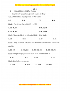 Câu 2: Tìm số tròn chục x biết: 27 < x < 55 A. 30, 40, 50 B. 50, 60, 70 C. 20, 30, 40 D. 40, 50, 60,