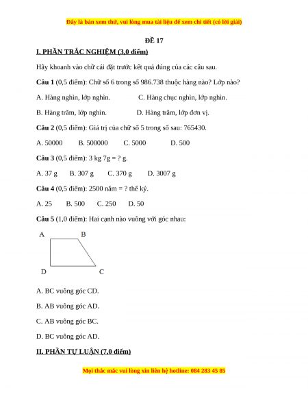 Đề thi Toán lớp 4 cuối kì 1 năm 2022 - 2023 (Đề 17)