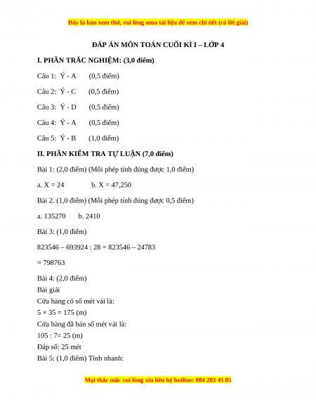ĐÁP ÁN MÔN TOÁN CUỐI KÌ I – LỚP 4