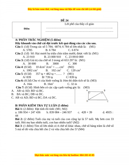 Đề thi Toán lớp 4 cuối kì 1 năm 2022 - 2023 (Đề 24)