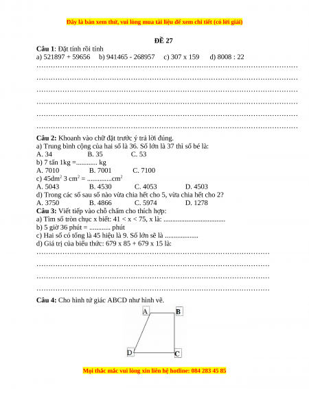 Đề thi Toán lớp 4 cuối kì 1 năm 2022 - 2023 (Đề 27)