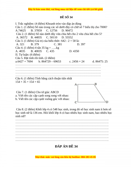 Đề thi Toán lớp 4 cuối kì 1 năm 2022 - 2023 (Đề 34)