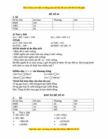 Hỏi: Tổng số tiền mua gạo là bao nhiêu đồng ĐÁP ÁN ĐỀ SỐ 45 1. Số Số bị chia Số chia Thương Dư 8469 241 35 34 1983 14 141 9 7936 26 305 6 2. Tìm x, biết