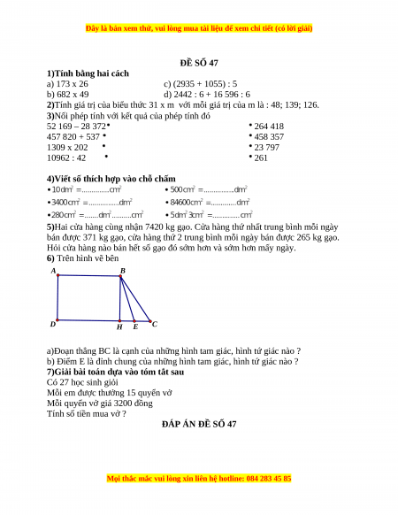 Mỗi quyển vở giá 3200 đồng Tính số tiền mua vở ? ĐÁP ÁN ĐỀ SỐ 47