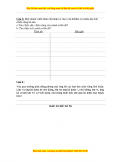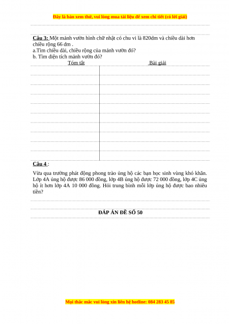 hộ ít hơn lớp 4A 10 000 đồng. Hỏi trung bình mỗi lớp ủng hộ được bao nhiêu tiền? ĐÁP ÁN ĐỀ SỐ 50