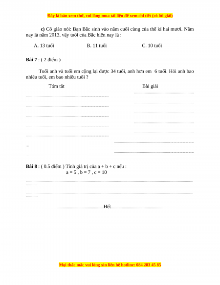 A. 13 tuổi B. 11 tuổi C. 10 tuổi Bài 7 : ( 2 điểm )