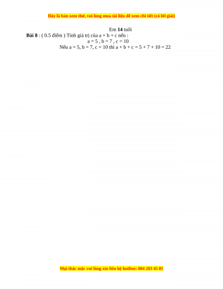 Bài 8 : ( 0.5 điểm ) Tính giá trị của a + b + c nếu : a = 5 , b = 7 , c = 10