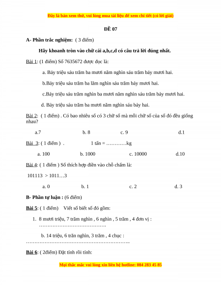 Bài 1: (1 điểm) Số 7635672 được đọc là: