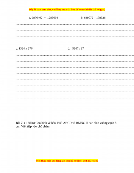 Bài 7: (1 điểm) Cho hình vẽ bên. Biết ABCD và BMNC là các hình vuông cạnh 8