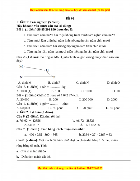 Đề thi Toán lớp 4 cuối kì 1 năm 2022 - 2023 (Đề 9)