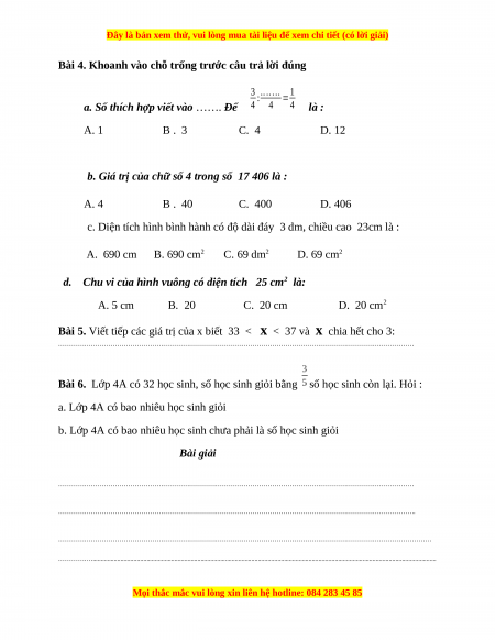 Đề thi Toán lớp 4 cuối kì 2 (Đề 1)