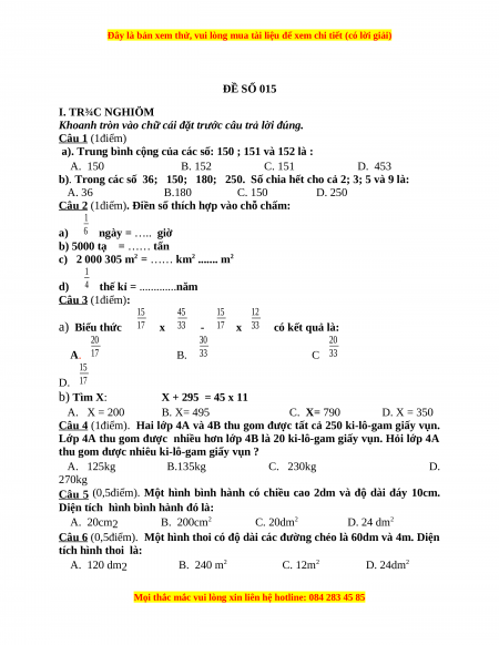 Đề thi Toán lớp 4 cuối kì 2 (Đề 15)