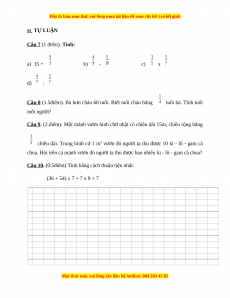 Câu 7. Tính (1điểm) mỗi phép tính đúng ( 0,25 điểm) 9 4 5 1 3 5 3 a) 15 + 3 = 18 b) 9 - 18 = 6 c) 5 x 7 = 7 4 2 d) 7 : 7 = 2 Câu 8.(1, 5điểm) Bài giải