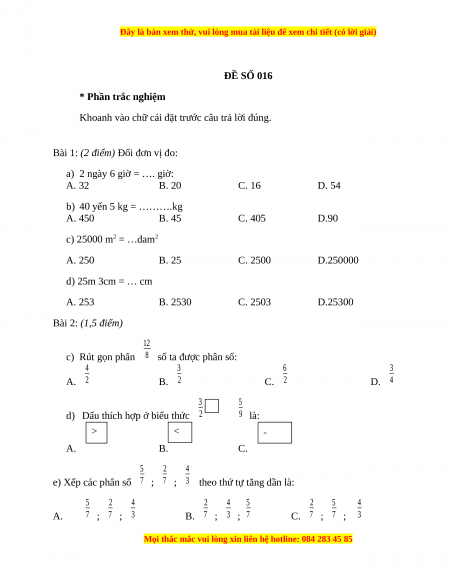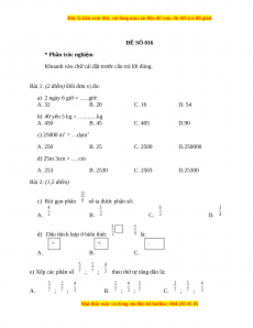 b) 40 yến 5 kg = ……….kg A. 450 B. 45 C. 405 D.90 c) 25000 m2 = …dam2 A. 250 B. 25 C. 2500 D.250000 d) 25m 3cm = … cm A. 253 B. 2530 C. 2503 D.25300 Bài 2: (1,5 điểm) 12