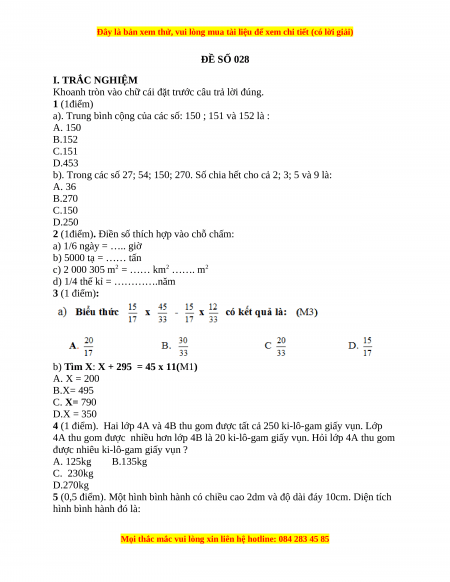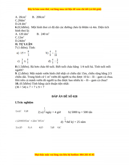 ĐÁP ÁN ĐỀ SỐ 028 I.Trắc nghiệm 2) a) ngày = 4 giờ b) 5000 tạ = 500 tấn d) thế kỷ = 25 năm