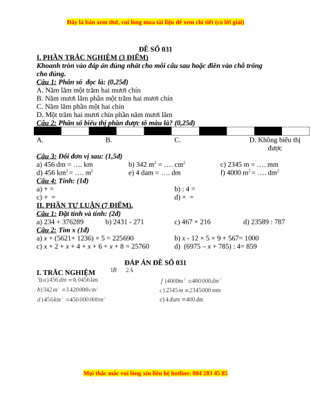 Câu 3: Đổi đơn vị sau: (1,5đ) a) 456 dm = …. km b) 342 m2 = …. cm2 c) 2345 m = …. mm d) 456 km2 = …. m2 e) 4 dam = …. dm f) 4000 m2 = …. dm2 Câu 4: Tính: (1đ) a) + = b) : 4 = c) + = d) × =