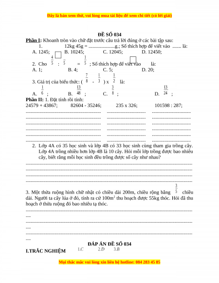 Đề thi Toán lớp 4 cuối kì 2 (Đề 34)
