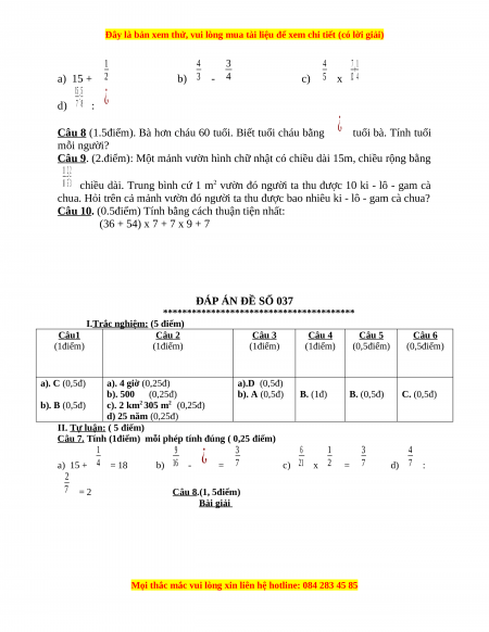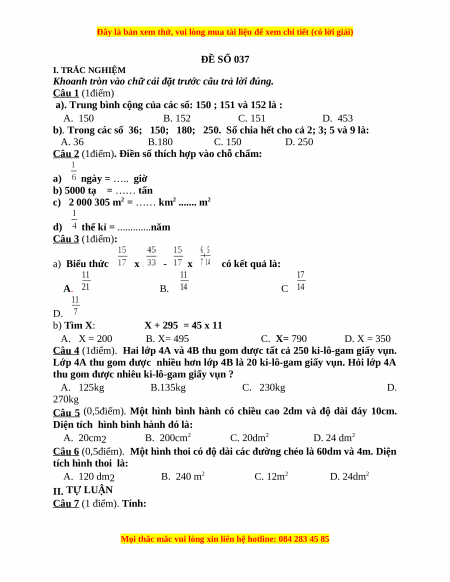Đề thi Toán lớp 4 cuối kì 2 (Đề 37)