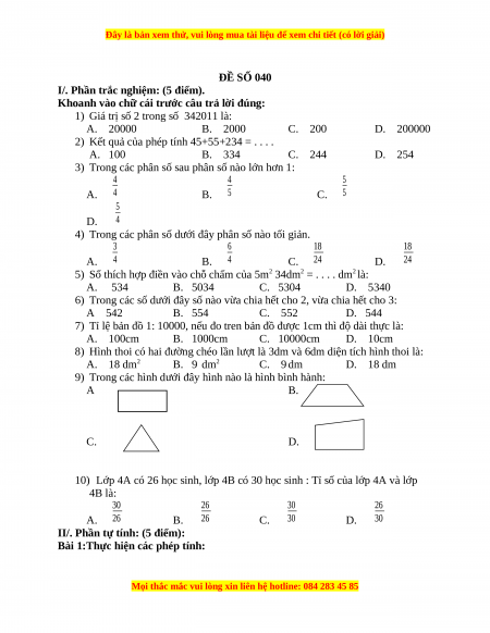 ĐÁP ÁN ĐỀ SỐ 040 I.TRẮC NGHIỆM II.TỰ LUẬN Bài 1.Tính Bài 2