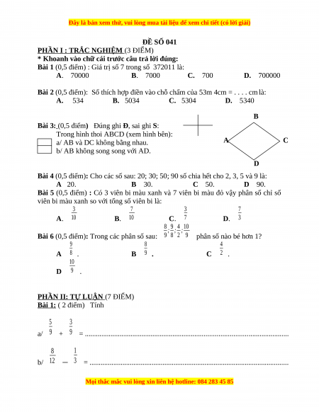 Đề thi Toán lớp 4 cuối kì 2 (Đề 41)