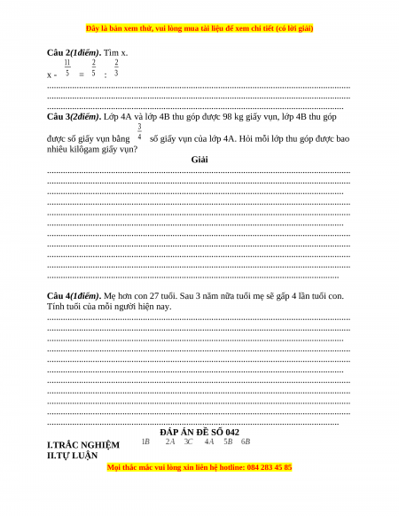 ĐÁP ÁN ĐỀ SỐ 042 I.TRẮC NGHIỆM II.TỰ LUẬN