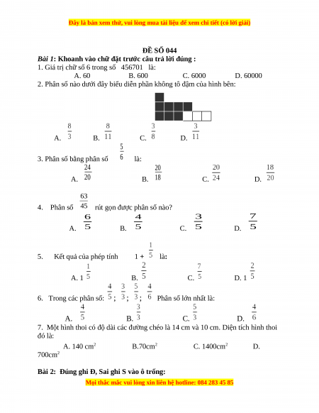 Đề thi Toán lớp 4 cuối kì 2 (Đề 44)