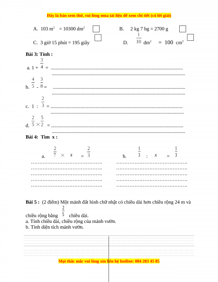 C. 3 giờ 15 phút = 195 giây D. dm2 = 100 cm2 Bài 3: Tính :