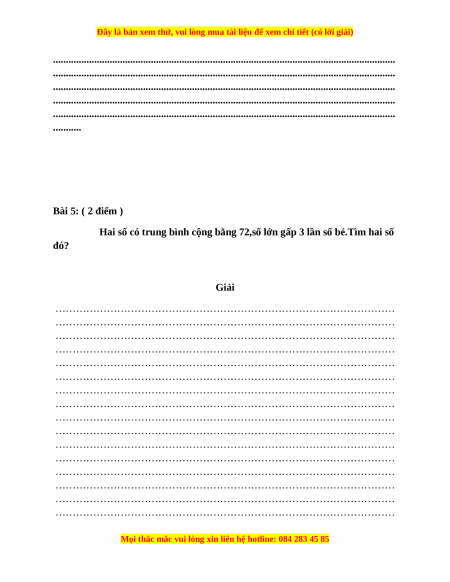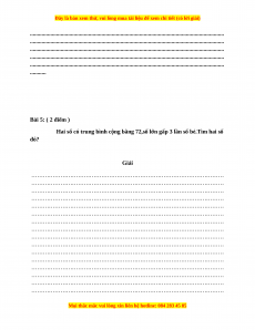 Câu 4:{1 điểm} Tổng hai số là 135.Tìm số bé biết rằng số lớn hơn số bé 45 đơn vị.