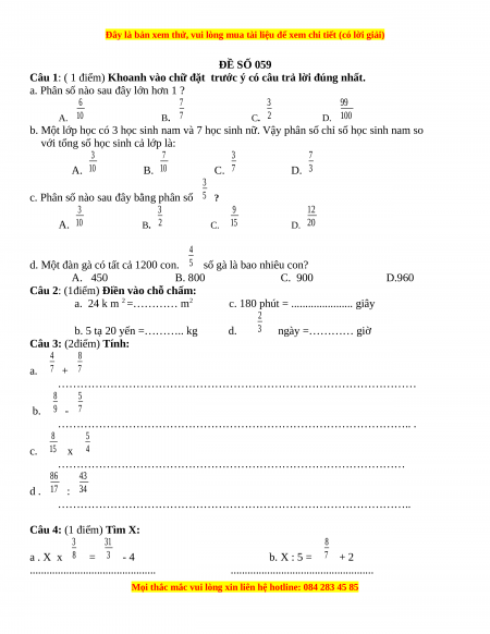 Đề thi Toán lớp 4 cuối kì 2 (Đề 59)