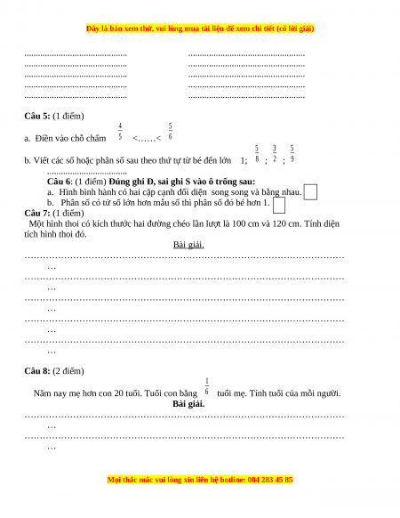 b. Phân số có tử số lớn hơn mẫu số thì phân số đó bé hơn 1. Câu 7: (1 điểm)