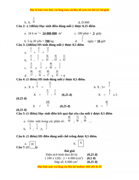 Câu 6: (1 điểm) HS điền đúng mỗi chỗ trống được 0,5 điểm. a. Đ b. S Câu 7: (1 điểm) Bài giải