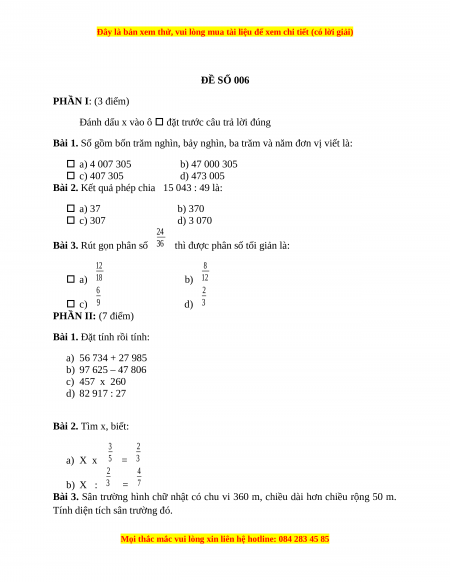 Đề thi Toán lớp 4 cuối kì 2 (Đề 6)