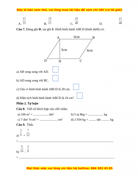 d) Diện tích hình bình hành ABCD là 24 cm2. Phần 2. Tự luận