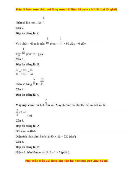 Phân số lớn hơn 1 là: Câu 2. Đáp án đúng là: C Vì 1 phút = 60 giây nên phút = × 60 giây = 6 giây Vậy phút = 6 giây Câu 3. Đáp án đúng là: B Phân số bằng là: Câu 4. Đáp án đúng là: C
