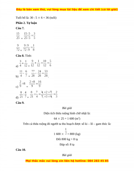 Câu 6. Bố hơn con 30 tuổi. Tuổi con bằng tuổi bố. Hỏi bố bao nhiêu tuổi? A. 34 tuổi B. 36 tuổi C. 6 tuổi D. 16 tuổi Phần 2. Tự luận