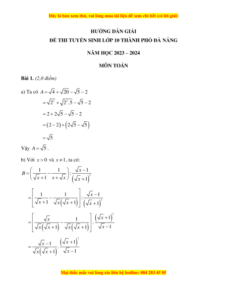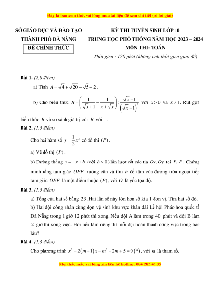 Đề thi Toán vào 10 TP Đà Nẵng năm 2024 (đề chính thức)