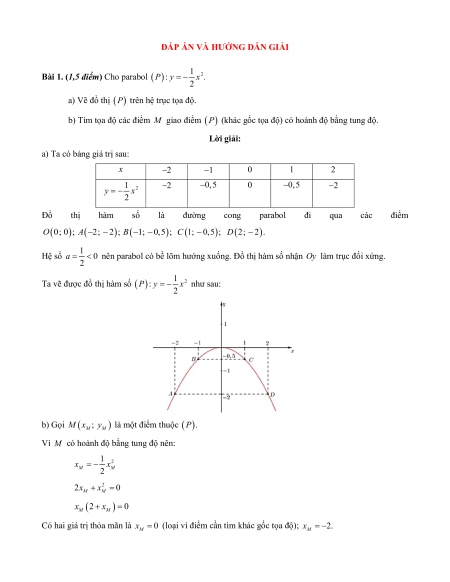 b) Tìm tọa độ cac điêm M giao điêm P (khac gôc tọa độ) co hoanh độ băng tung độ. Lời giải: a) Ta co bảng gia tri sau: x 2 1 0 1 2 1 2 y 0 0,5 x 2 0,5 2 2 Đô thi ham sô la đương cong parabol đi qua cac điêm