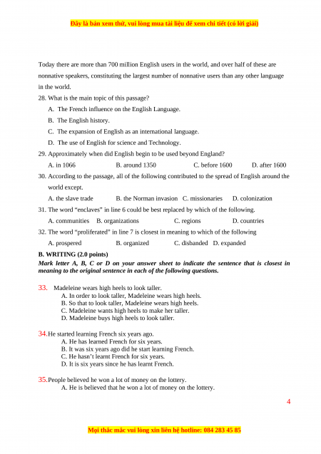 32. The word “proliferated” in line 7 is closest in meaning to which of the following A. prospered B. organized C. disbanded D. expanded B. WRITING (2.0 points)