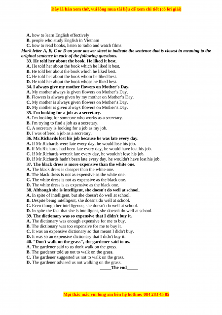 Mark letter A, B, C or D on your answer sheet to indicate the sentence that is closest in meaning to the