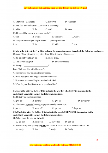 VI. Mark the letter A, B, C or D to indicate the word(s) CLOSEST in meaning to the