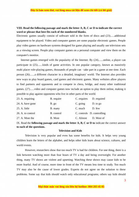 IX. Read the following passage and mark the letter A, B, C or D to indicate the correct answer