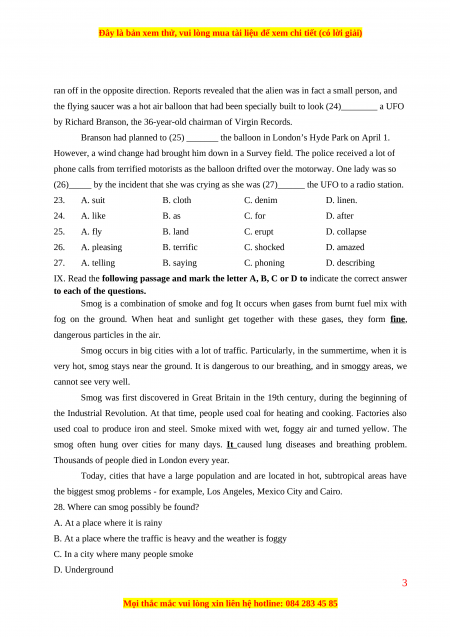 IX. Read the following passage and mark the letter A, B, C or D to indicate the correct answer