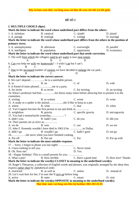 ĐỀ SỐ 2 I. MULTIPLE CHOICE (8pts)